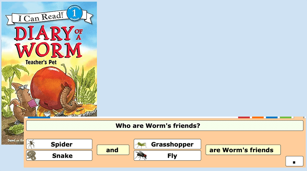In the Connect Set Diary of a Worm – Comprehension, students are offered choices from word sets to check comprehension of the book.