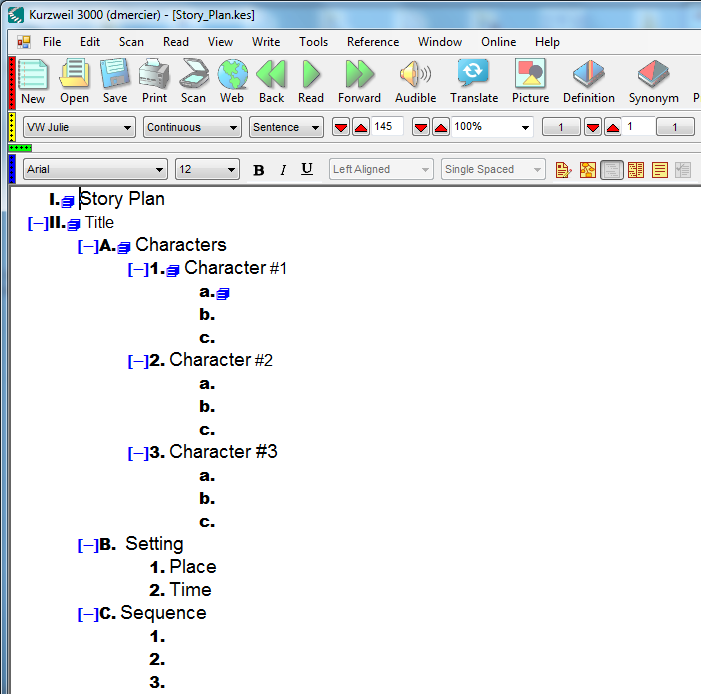 This outline template can be used to guide story writing. The student selects and describes characters, setting, sequence of events, problem, and solution. Through the writing process built into Kurzweil, the student can move seamlessly from this outline view, to brainstorm, split screen and draft to complete their story. *To use this template, remember to open the Writing Toolbar and begin in Outline view. this template supports the BC Ministry of Education PLOs for grades 2-7 Literacy Foundations English/Strategies/Thinking/Purposes of Writing: Created by Kim Robb & Rhonda Manning.
